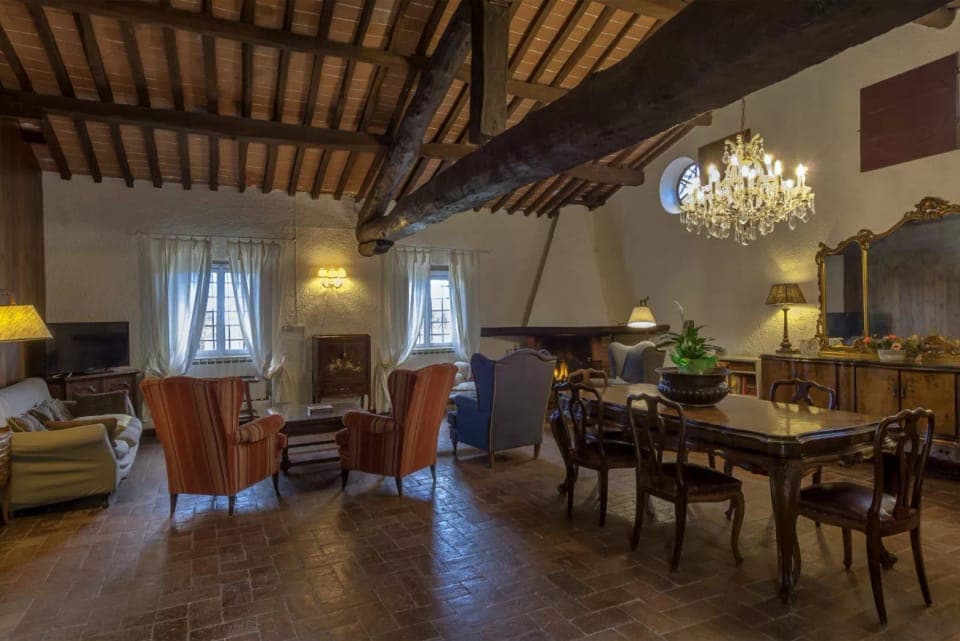 Taking up part of the ground floor of an ancient olive mill, this home is full of typically Tuscan rustic charm. Along with the wooden ceiling beams and terracotta floor tiles, guests will find a collection of antique furniture, ornate bed frames and an opulent chandelier. The ceramic tiles in the kitchen are rather fetching, too