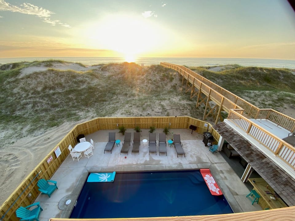 This home features a private pool (pool heat available)with a tiki bar and plenty of deck space for all your outdoor entertaining needs. A hot tub under the stars where you will be able to listen to the ocean while gazing at the night sky. Your private boardwalk provides easy access to the beach for a day of fun in the waves or early morning shell collecting. There are plenty of chairs and eating areas around the pool for relaxing and spending time outdoors. A small sand children's play area offers the best of both worlds around the pool. Beach chairs, towels, and pool toys are provided to make your stay more enjoyable.