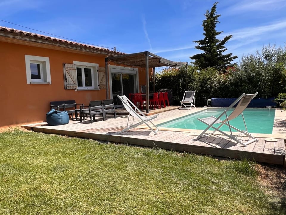 La superbe piscine avec terrasse bien équipée (grande table de jardin, pergola, plancha, guirlande guinguette...)