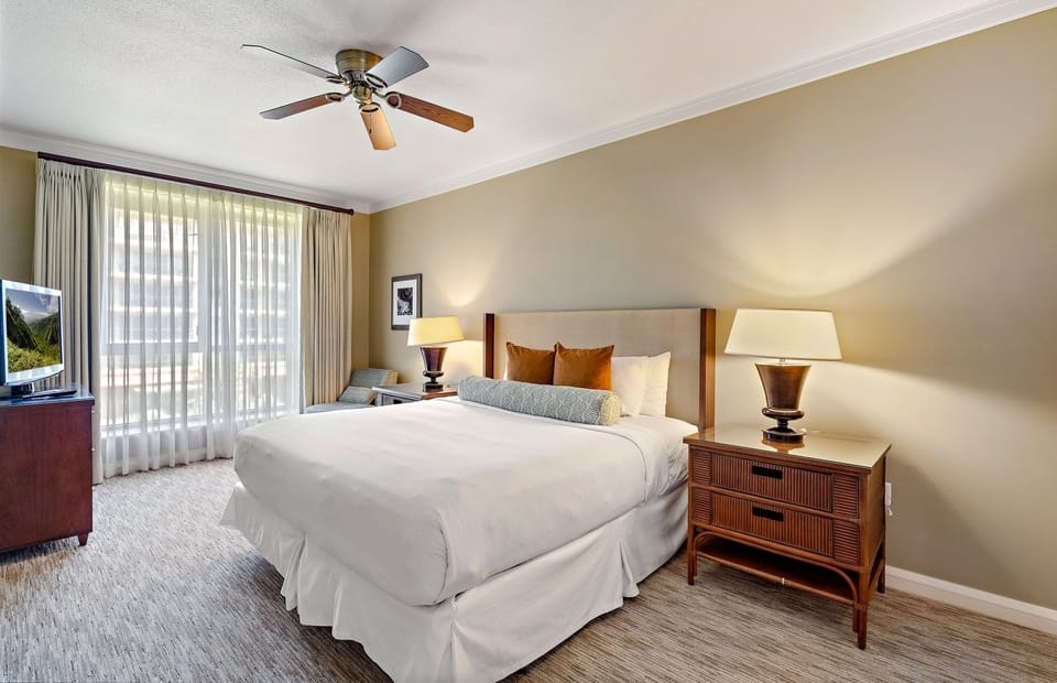 This premier six-bedroom offering combines three neighboring 3rd-floor two-bedroom suites to create the perfect place for your group to gather, reconnect, and celebrate. Konea 303 and 305 occupy a fantastic interior courtyard location directly next door to one another and showcase the golden sands of Kaanapali North Beach and stunning ocean views. Konea 304 is an exterior suite just across the hall, highlighting a partial ocean view and the lush West Maui Mountains.