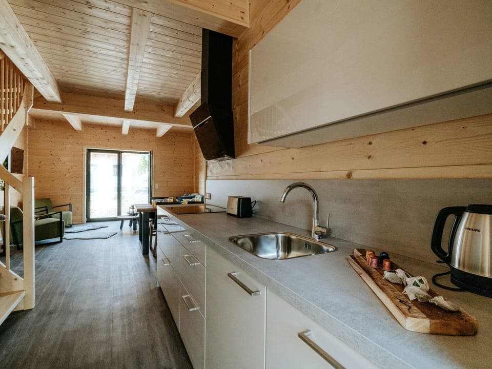 The chalets here may be newly built, but they’ve got all the charm of traditional ski lodges with a pine-clad exterior and A-frame roof. Mountains loom in the distance and cows graze in the field in front. Inside, the timber walls have been left on display for that cosy mountain feel. The open-plan living, kitchen and dining room is a social space for group gatherings and there are two balconies to choose from, looking out over the mountains.