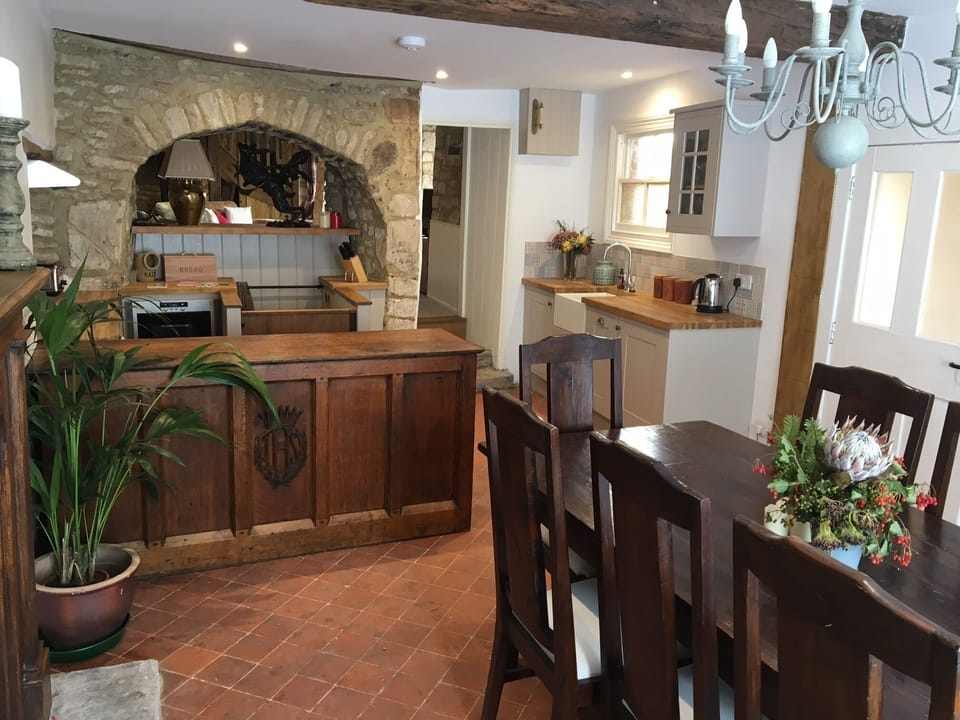 The Hall is a three bedroom cottage, with two bathrooms and a sofa bed in the eaves of the old Medieval hall, the old ‘A’ frames are still visible. The Hall can sleep up to 9 people, all the bedrooms have there own style, the first bedroom has a king size bed and open up to the eaves, the next bedroom also has a king size bed, with a window looking out over Burford High Street and over the roofs to the church and the valley. The third bedroom has a triple bunk bed, with a double at the bottom and a single over, also enjoying the views over Burford. The bathrooms both have toilets, one with a large shower, the other with a bath/shower. The ground floor is open plan with kitchen dining room with log burner, leading onto a sitting room with TV and behind the stairs a snug/reading room with large fireplace and wood burning stove. There is also a cellar, which has been renovated as has the whole building, it still has the original worn steps leading down and the wooden steps where the beer barrels would have come down, you are more than welcome to use this area, but there is restricted headroom and the steps are not suitable for the unsteady.