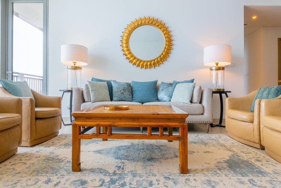 Step through the front door to be greeted by the bright and luxurious open-plan living space, with a plush sofa, elegant light fixtures and a dining table, where you can gather everyone for those delicious family feasts. We love the colour scheme which subtly mirrors the apartment’s proximity to the sea. Out on your private balcony, you can admire the breathtaking views while you sip a cool drink and contemplate the sun setting over the Gulf.