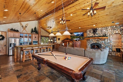 The essence of mountain luxury unfolds in a sprawling tri-level layout with a grand open main living area that seamlessly blends the living room, kitchen, and dining areas. Vaulted ceilings, adorned with pine paneling and log beams, welcome you into a spacious and inviting retreat. A beautiful wood-burning rock fireplace creates a cozy ambiance where you can relax on the plush sectional couch and watch your favorite movies on the 85” smart flat-screen TV.