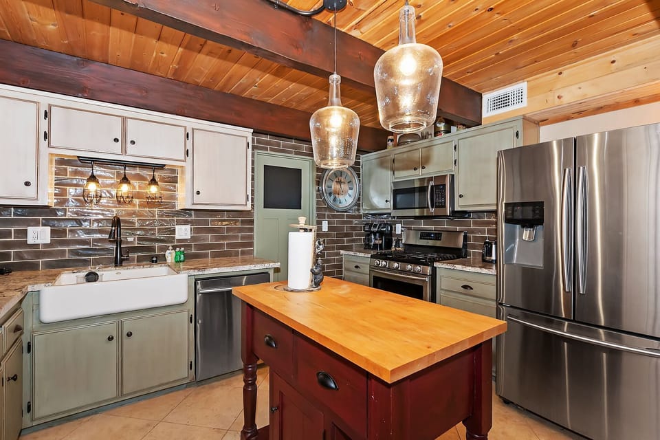 ✓ Kitchen: Fully equipped with stainless steel appliances, granite countertops, a large farmhouse sink, and ample prep space.