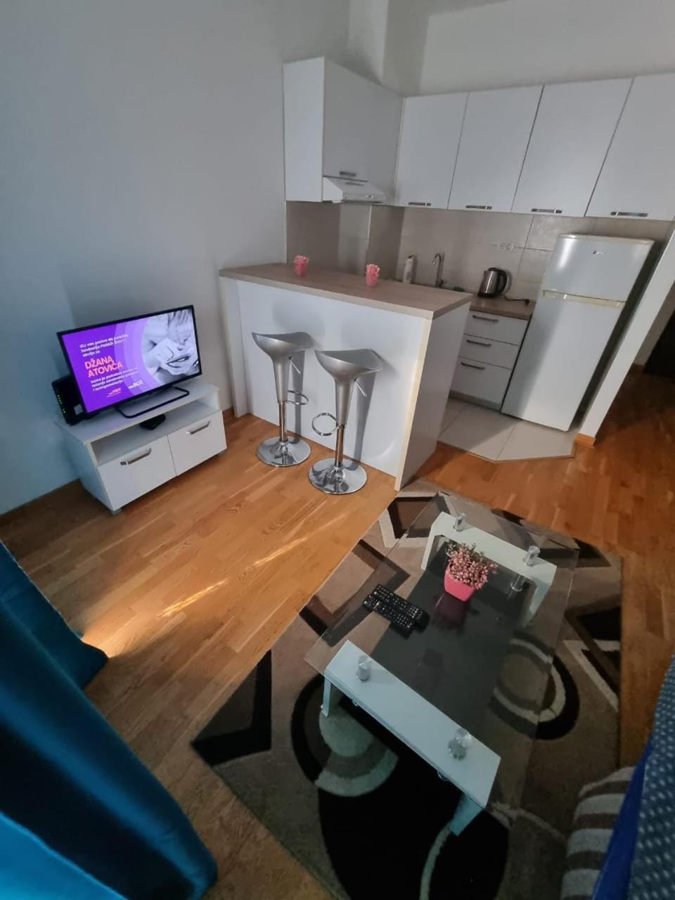 Za razliku od fotografije smeštaja, postoji samo jedna(napukla ) barska stolica i tepih(neočišćen) je bio sklonjen u ormar..