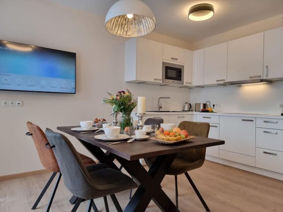 "Brillenschnucke Home", 2-room apartment 45 m2 on 1st floor. Spacious and bright, very modern and cosy furnishings: 1 double bedroom with cable TV (flat screen). Kitchen-/living room (dishwasher, 4 ceramic glass hob hotplates, toaster, kettle, microwave, electric coffee machine, Capsules for coffee machine (Nespresso)) with 1 sofabed. Shower/WC. Wooden floors, natural stone floors. Terrace 18 m2. Marvellous view of the mountains. Facilities: Internet (WiFi, free). Parking space n 3 (1 car). Please note: non-smokers only.
