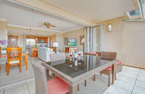 Boasting an incredible oversized lanai and spacious interior, Konea 212 is a luxurious two-bedroom mountain view suite offering a spacious primary bedroom and converted den with custom doors for privacy. Enjoy frequent afternoon rainbows over the West Maui Mountains from the lanai's lounge area or a meal with family around the outdoor dining table.