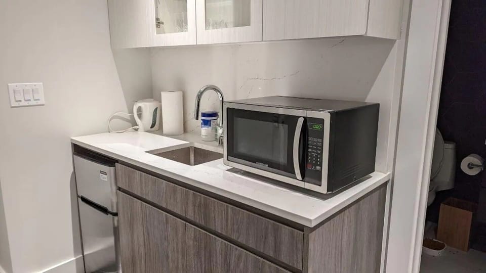 Kitchenette includes a refrigerator, microwave, electric cooktop, toaster, espresso machine and utensils.