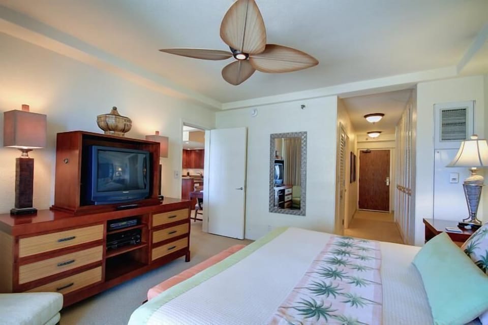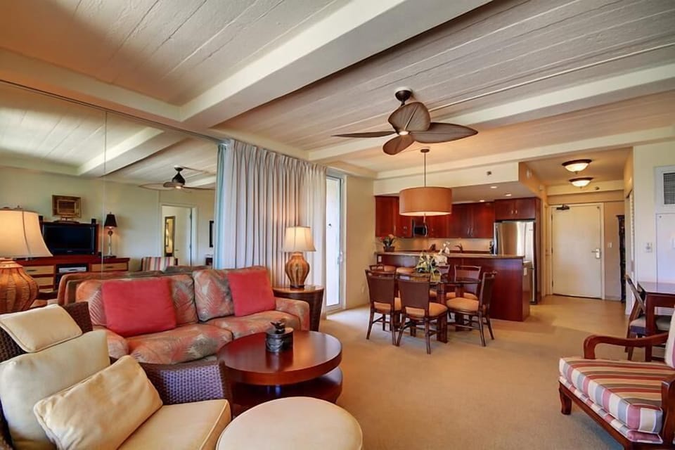 Located on the desirable 5th floor and overlooking the serene interior courtyard, the suite treats you to epic West Maui Mountain and lovely partial ocean views.