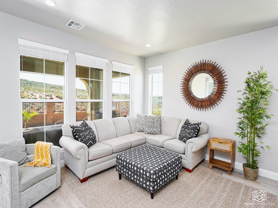 Centrally located to so much that Southern Utah has to offer, The Jungalow is the perfect vacation rental for your next family getaway! With its unique décor, beautiful furnishings, and fully equipped kitchen, you will find all that you need and more when you book this rental! Whether you are lounging around watching movies on the flat-screen TVs, hosting a ping pong tournament in the garage, or sending the kids upstairs to play the arcade game, this awesome home has something for everyone! Comfy couches are found throughout the home and the outdoor patio has great seating to enjoy the evenings to the fullest!