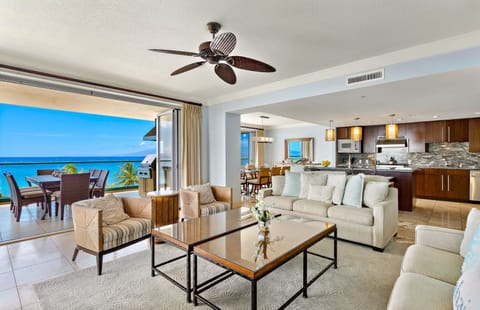 Boasting a modern island design full of warmth and aloha, the 3BR oceanfront suite, Suite 402, delivers breathtaking views of the Pacific Ocean from its 4th-floor vantage point in the closest column to the ocean at the entire Honua Kai Resort. From its travertine floors and gorgeous granite countertops to its refined wood cabinetry and high-end Viking appliances, Suite 402 delivers unparalleled quality. Enjoy spectacular year-round sunsets over Maui's neighboring islands, Lanai and Molokai, from the suite's 600 sq ft wraparound lanai that even offers a built-in Viking BBQ grill.
