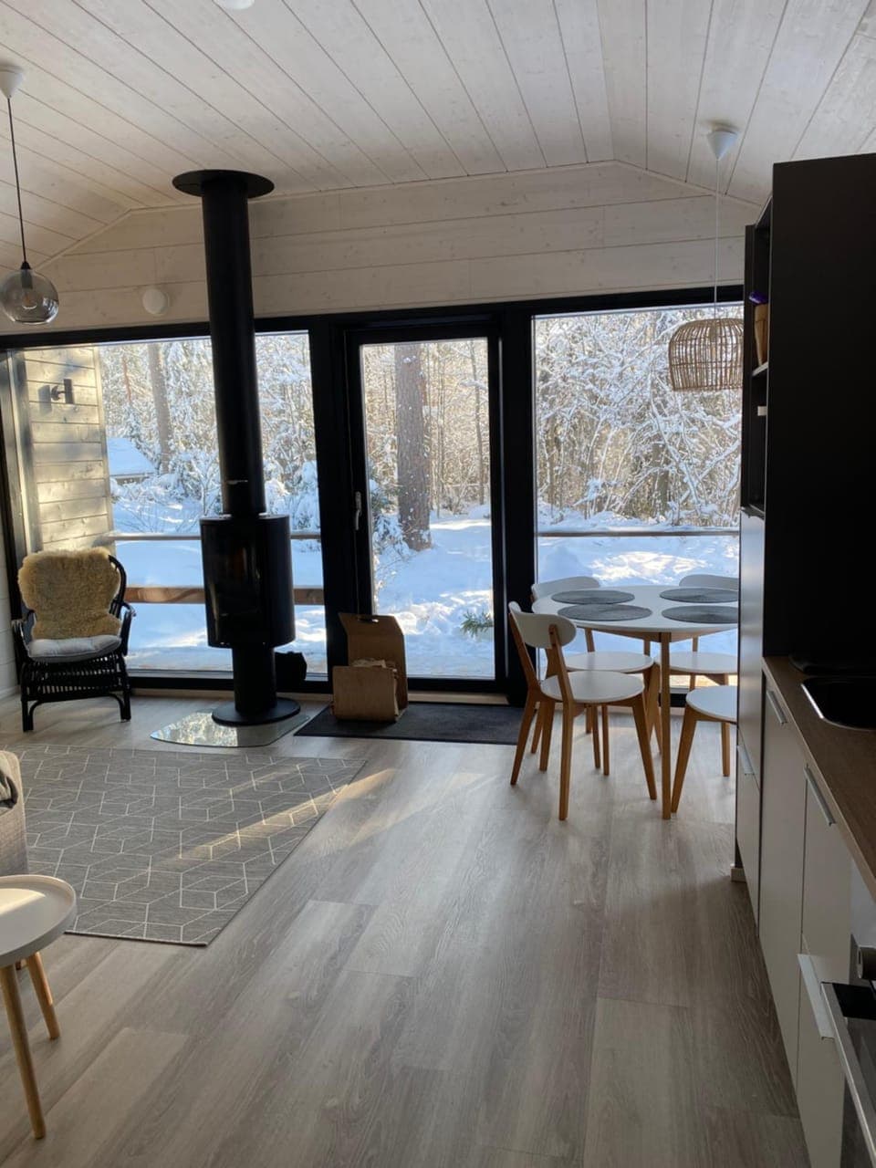 Meitä onnisti kun oli just upea pakkassää ja lunta leijaili hiljalleen. Näkymä isoista oleskelutilan ikkunoista oli kerrassaan satumainen. Lämpöpumppu ja takka pitivät huolen että sisällä oli kuitenkin mukavan lämmin.