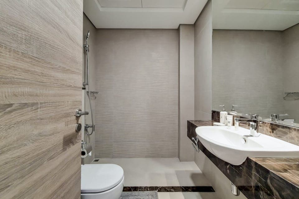 Soak up the year-round Dubai sun in the shared pool or jacuzzi when you stay at this modern apartment. There’s a children’s pool and kid’s play area too, and lots of amenities, such as a gym, shops, restaurants and bars, so there’s plenty to do here. When you feel like exploring, the Dubai Mall is twenty-three minutes in the car, the Palm Jumeirah is thirty-five minutes, and the Burj Al Arab is a thirty-three-minute ride.