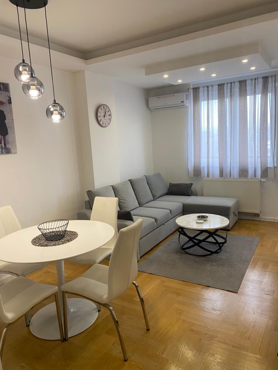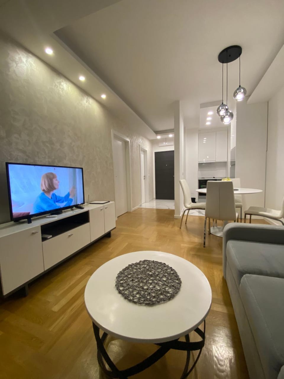 The apartment is very nice designed. Furniture is new , modern style. The kitchen is equipped with the necessary dishes, coffee and sugar. Everything is clean.