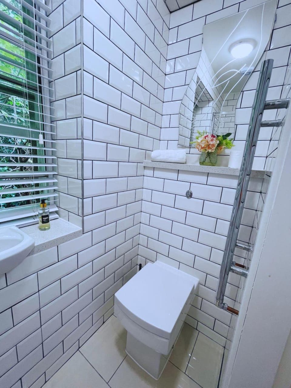 A Lovely little bathroom with nice shower pressure. Clean toilet and functional window.