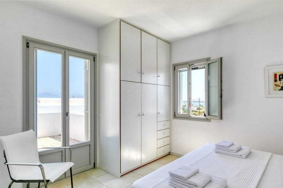 This minimalistic villa is all about the location. While the interiors may be a little too simple for everyone’s taste, the ground-floor bedroom is perfect for children or those with limited mobility. Outdoors, you’re treated to alfresco dining opportunities, a private pool and sea views – all the ingredients needed for a relaxed stay. That said, adventure seekers take note – Santa Maria beach, one of the finest stretches of sea and sand on the island, is known for its watersports and is just over a kilometre away. Further afield, a fifteen-minute drive will take you to Naoussa and its golden beaches lined up around the natural bay.