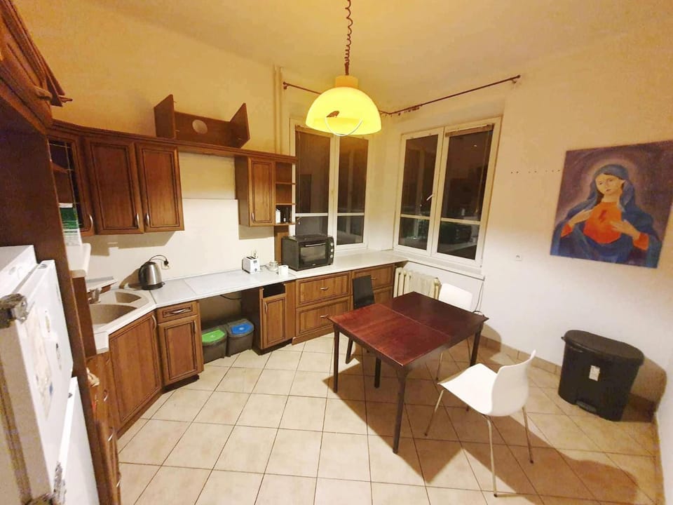 Kuchnia ciemna, ale wyposażona ok. Memiczna metalowa futryna wklejona w oryginalną - nie wiem czy to minus, bo jest nieestetycze ale jednocześnie bawi.