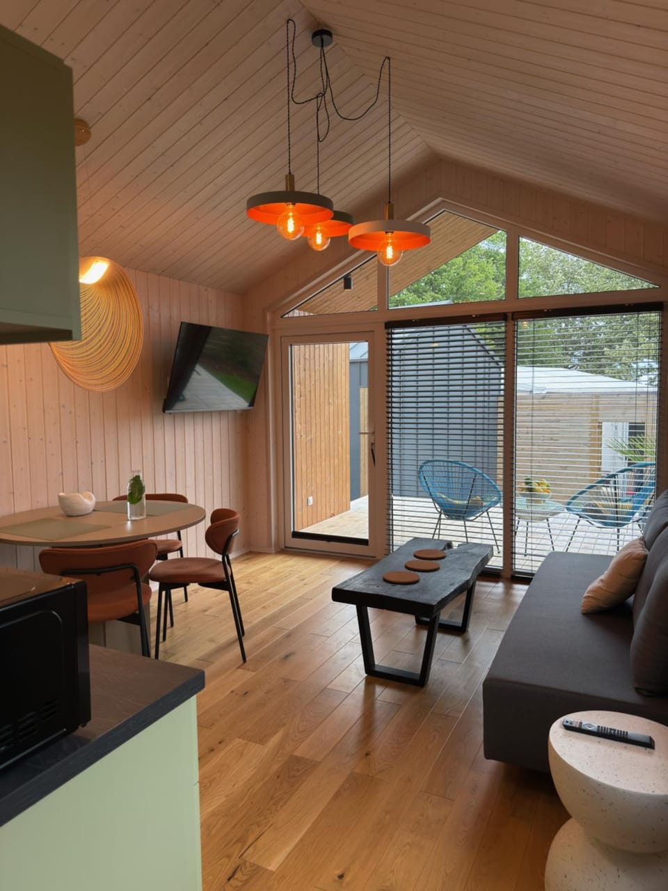 Hałas. Domki położone są na posesji między dwoma ruchliwymi jezdniami więc szum samochodów i pieszych jest ciągły.Może to być uciążliwe,bo nie pozwala na spokojny odpoczynek na tarasie. Posesja na której są domki jest nieduża,więc nie ma przestrzeni i sprawia wrażenie ciasnoty. Zupełnie subiektywnie sugeruję zamontowanie półek w sypialni po prawej stronie przy łóżku (domek pistacjowy) i w łazience na kosmetyki,a także wieszaka na kurtki w pobliżu drzwi wejściowych.