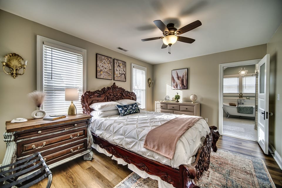 The three bedrooms are all beautifully furnished with comfortable beds and high-quality linens to ensure a good night's sleep. The Master Bedroom boasts a hand-carved mahogany bed with a vintage French Rococo theme and has an en-suite bathroom with a large soaking tub and double vanity. The second bedroom is what we affectionally call The Lavender Room, complete with a faux garden wall with wisteria and vines. The Lighthouse bedroom has a handmade, stained glass picture window of the Huron Lighthouse. Stunning shades of blue with serene beach artwork, our nod to Lake Erie. This room is guaranteed to make you feel relaxed and calming.