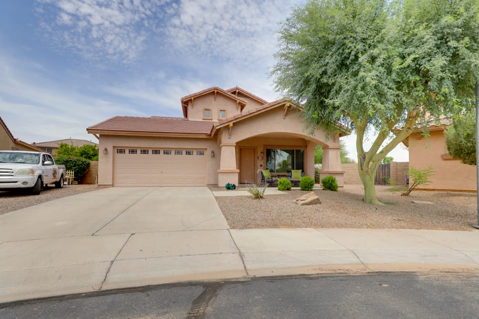 The ultimate desert getaway awaits at this beautiful 5-bedroom, 3.5-bath Maricopa home! Perfect for families or groups of friends, this vacation rental boasts a full kitchen, 2 cozy living spaces, and a private backyard oasis with tons of amenities to keep you occupied. Lounge by the outdoor pool, take a dip in the spa tub, or fire up the gas grill with loved ones. If you’re looking to venture out, make a splash at the Copper Sky Recreation Complex or test your luck at Harrah’s Ak-Chin Casino.