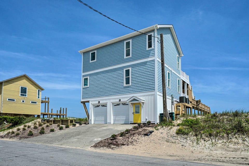 With a quiet beachfront location also in proximity of a lively beach, this Topsail Beach paradise boasts 2 beachfront decks totaling 1,000 square feet, gas and charcoal grills, stunning water views, and a private boardwalk directly to the beach. Enjoy the modern comforts inside this 5-bed, 4.5-bath vacation rental, mixed with proximity to deep sea excursions, golf, aquatic sports, and oceanfront restaurants. Book now for sunrise strolls on the shore and afternoon barbecues with your loved ones!