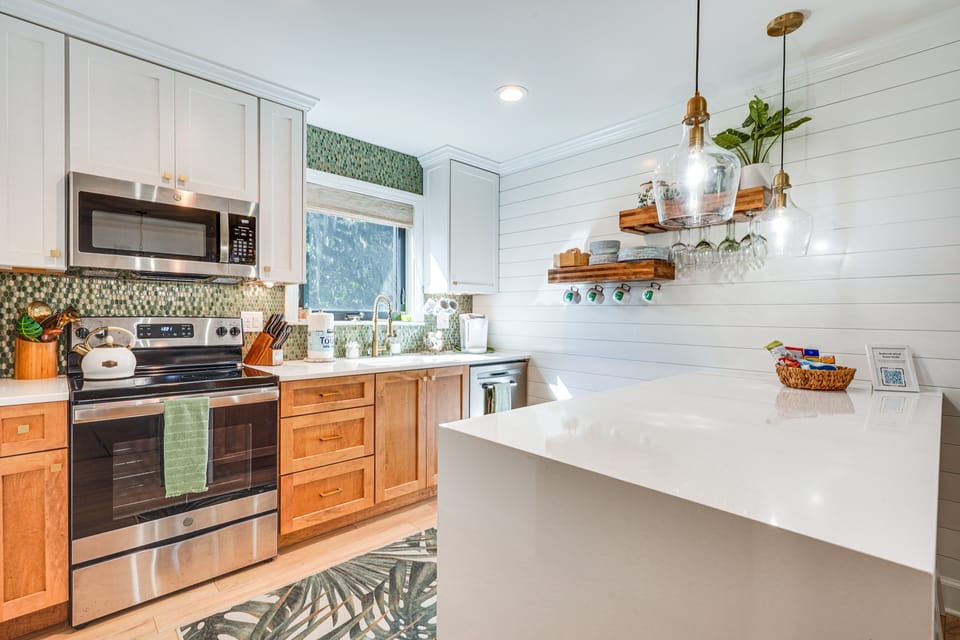 KITCHEN: Fully equipped w/ cooking basics, microwave, dishwasher, Keurig coffee maker, kettle, dishware/flatware, breakfast bar w/ seating
