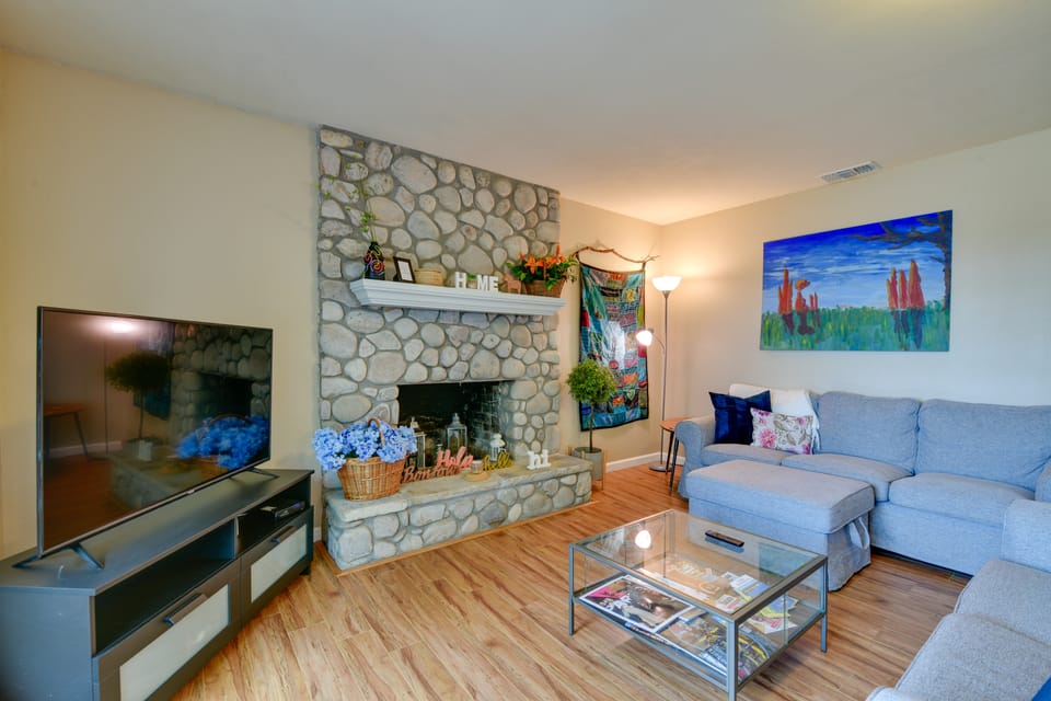 Decorative Rock-Wall Fireplace | Wraparound Deck | Quiet Neighborhood