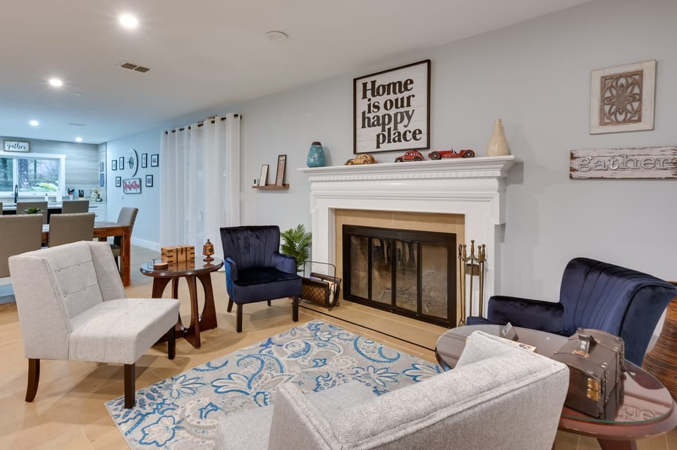 INDOOR LIVING: Smart TV, fireplace, dining table, pool table, board games, books, open floor plan, updated interior