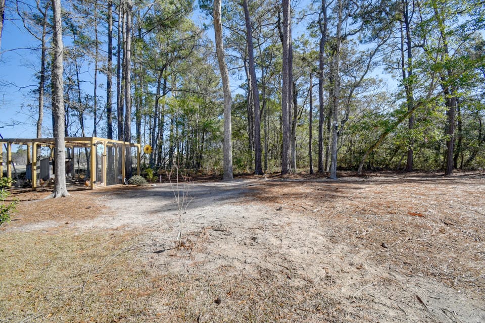 Bury your toes in the sand at this vacation rental in Calabash, NC! Nestled just 4 miles from the shoreline and surrounded by nature, this 1-bath studio cabin offers a peaceful place to return to each evening. Leash up your furry friend and make a splash at Sunset Beach one day, then hit the links at The Pearl Golf Course the next! Refuel after your adventures by grabbing a bite to eat at The Oyster Rock Waterfront Seafood, then kick back at home with s’mores around the wood-burning fire pit.