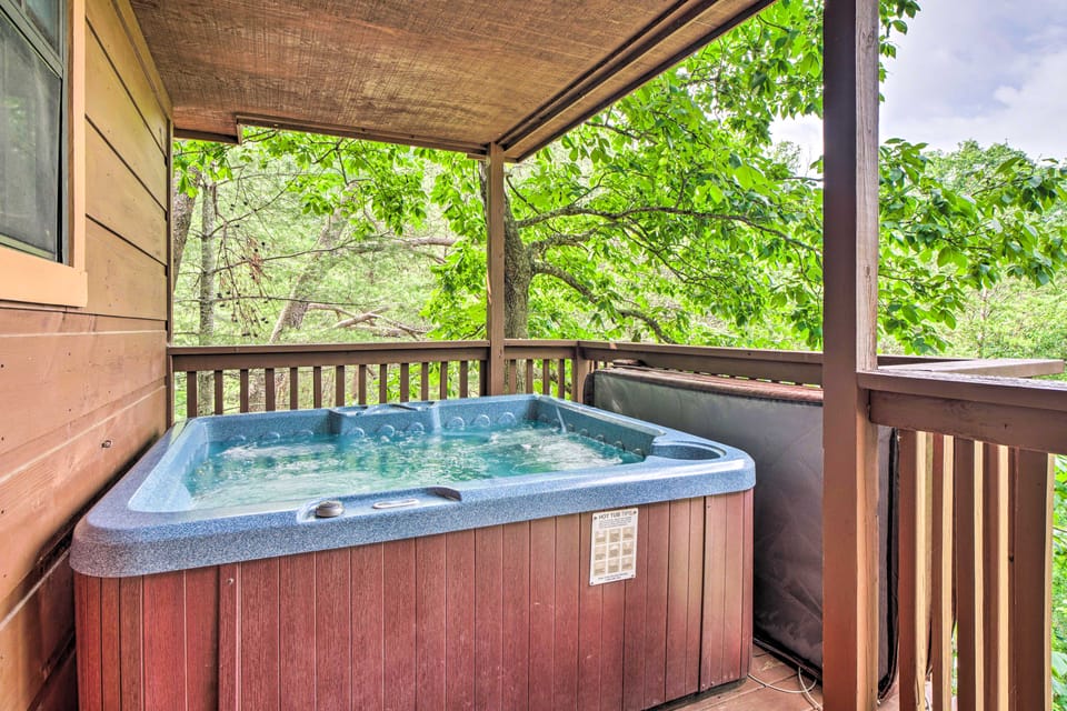 What amenities are available at Central Sevierville Cabin w/ Hot Tub & Views!?