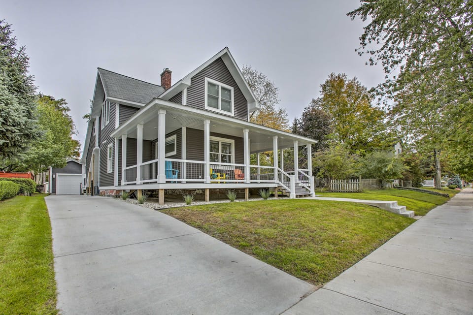 Explore the best of Ludington from the comfort of this charming, main-floor apartment. This 2-bedroom, 2-bathroom vacation rental features a fully equipped space with modern furnishings, a spacious porch, and a shared yard with a fire pit, along with a quiet-yet-central location under 1 mile from Lake Michigan. Choose from a variety of nearby activities including renting a boat from a nearby marina to fish, visiting the shops and restaurants downtown, or simply relaxing on the beach come summer.