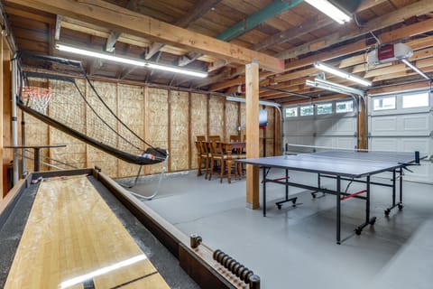 INDOOR LIVING: Smart TVs w/ cable, dining table, electric fireplace, shuffleboard, ping pong table, basketball game, open floor plan, modern-chic decor, board games
