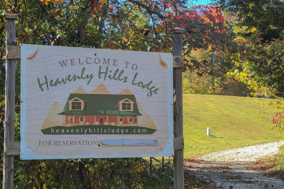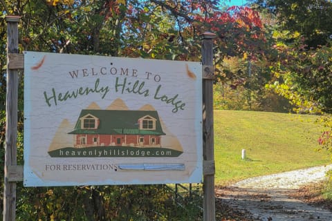 - 'Heavenly Hills Lodge' outdoor amenities include 2 fire pits, a 6-acre lake, corn hole, basketball, and an assortment of water floats