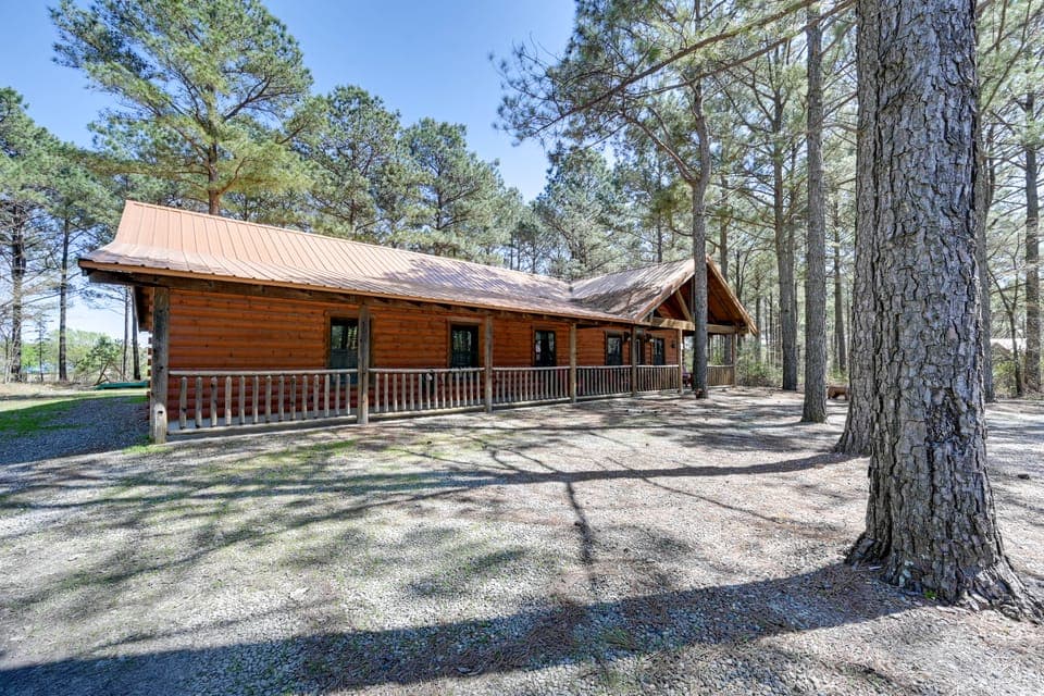 Experience a unique combination of rustic relaxation and lake luxury in this 3-bedroom, 2-bathroom vacation rental cabin in Broken Bow. Located mere minutes from the lake and offering a hot tub, furnished deck, foosball table, and fire pit, this 2,200-square-foot home for up to 14 is truly one-of-a-kind. Whether you spend your days fishing in Mountain Fork River, luxuriating in the hot tub, or waterskiing on Broken Bow Lake, you're sure to feel right at home in this Sooner State sanctuary.