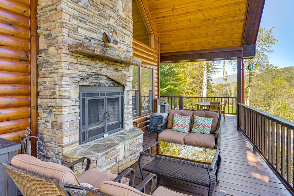Plan your North Carolina country retreat to this luxurious 2-bedroom, 3-bath vacation rental in scenic Hayesville! Nestled in the heart of nature, this cozy abode offers a refined rustic interior and a wraparound deck with a fireplace and jaw-dropping views — perfect for a winter escape with your group. Whether you hike the on-site trails or explore Bell Mountain, this gem is the ideal home base!