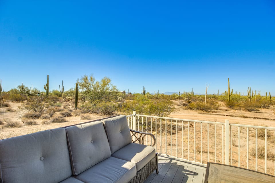 Id always wanted to experience staying in the desert among the saguaros but didnt want to camp bc of travelling alone and not having camping experience. This place had all the beauty and quiet i was looking for but hosts nearby if needed. The 2 viewing decks are raised , so i wasnt worried about snakes or other wildlife. The covered ground level patio was a perfect shady retreat during the day. Lots of comfy seating and outdoor dining furniture. The house was very clean and had everything you could need. Beautifully designed! Views from every window. Not much of a trek to great state and ntl parks, but you can walk the roads there and see lots of wildlife and the saguaros. Star gazing was incredible!