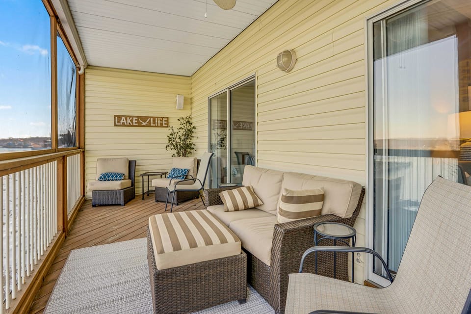 Plan your majestic Missouri lake escape to this 4-bedroom, 3-bathroom vacation rental overlooking the Lake of the Ozarks! This expansive condo offers a beach-themed interior with a pristine kitchen, wet bar, 2 bedroom suites, 2 living rooms, a fireplace, as well as 2 screened-in porches boasting Main Channel views. Hike Lake of the Ozarks State Park, golf at Margaritaville Lake Resort, or simply enjoy the Main Channel sunset from one of the private porches of this lakefront Osage Beach condo!