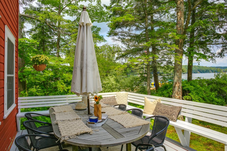 STEP OUTSIDE: Front porch, picnic table, back deck w/ outdoor dining table, sun umbrella, lighting, patio furniture & charcoal grill, backyard w/ hammock & wood-burning fire pit, private dock w/ Pleasant Lake acess