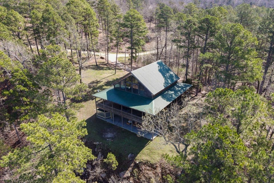 It was absolutely beautiful, from the moment that we woke up until the time our heads hit the pillow. Close to Angler's Restaurant and JoJo's Restaurant (both with a great view of the river) and we could still see the cabin at the top of the mountain from JoJo's. Less than 2 miles from Sylamore Creek's Swinging Bridge where we swam for hours, swung from a rope on the bridge, some of us even jumped off the bridge into the water (20 foot deep I might add), into some of the coldest water that ever hit your body. Very grateful for the experience of a lifetime. This cabin kept us close enough to all sorts of eminenities. Yet far enough away to enjoy all it's wonder. And, we even enjoyed morning flybys as aircraft of different sorts would show off as they passed through.