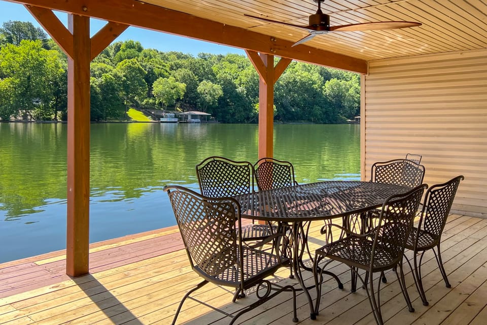 OUTDOOR LIVING: Spacious private dock w/ swim ladder & furnishings, gas + charcoal grills, screened-in porch, multi-level deck, yard, hammock, electric hill tram to dock