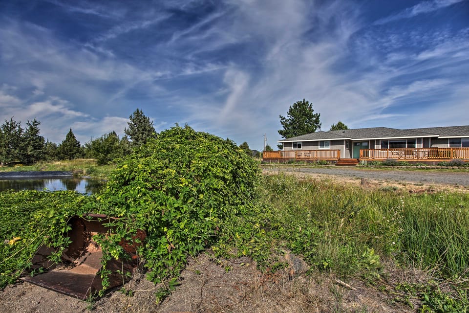 Offering the perfect balance between ease of access to Downtown Bend and the joys of the peaceful Oregon high desert, this 4-bed, 2-bath East Bend vacation rental is the perfect family retreat! Wander the Deschutes National Forest, ski on Mt. Bachelor, explore Bend's downtown district, or just listen to the tranquil sound of the rapids. This single-story home sits on 5 acres and has an inviting interior with a full kitchen, hop farm, and stunning views of Oregon's Cascade Mountains!