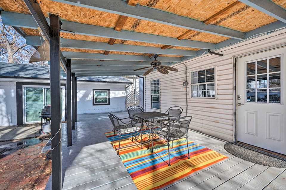 SHARED OUTDOOR LIVING: Covered deck w/ outdoor dining area, fan, gas grill, fenced yard