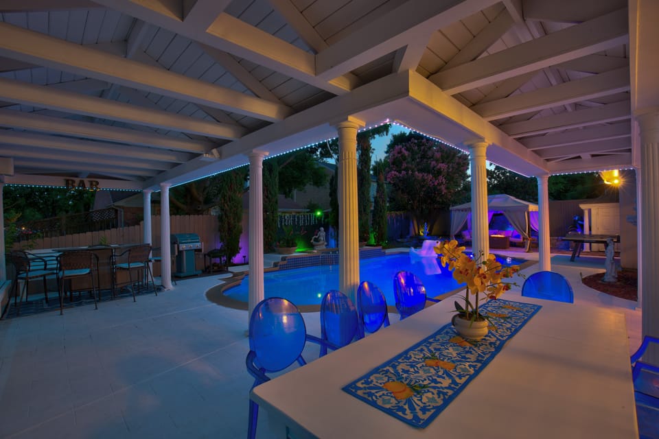 Experience a unique blend of Southern serenity and unforgettable fun at this stunning Rowlett vacation rental! Located near Lake Ray Hubbard, this 4-bedroom, 2-bath house offers convenient proximity to local marinas, golfing, and parks. Enjoy some water fun or stay put and take advantage of 'The Mermaid Cove’s' private pool, fireplace, poolside ping-pong table, and light-up foosball table w/ effects & music. Watch a classic on the projector while enjoying the popcorn and snow cone machines!
