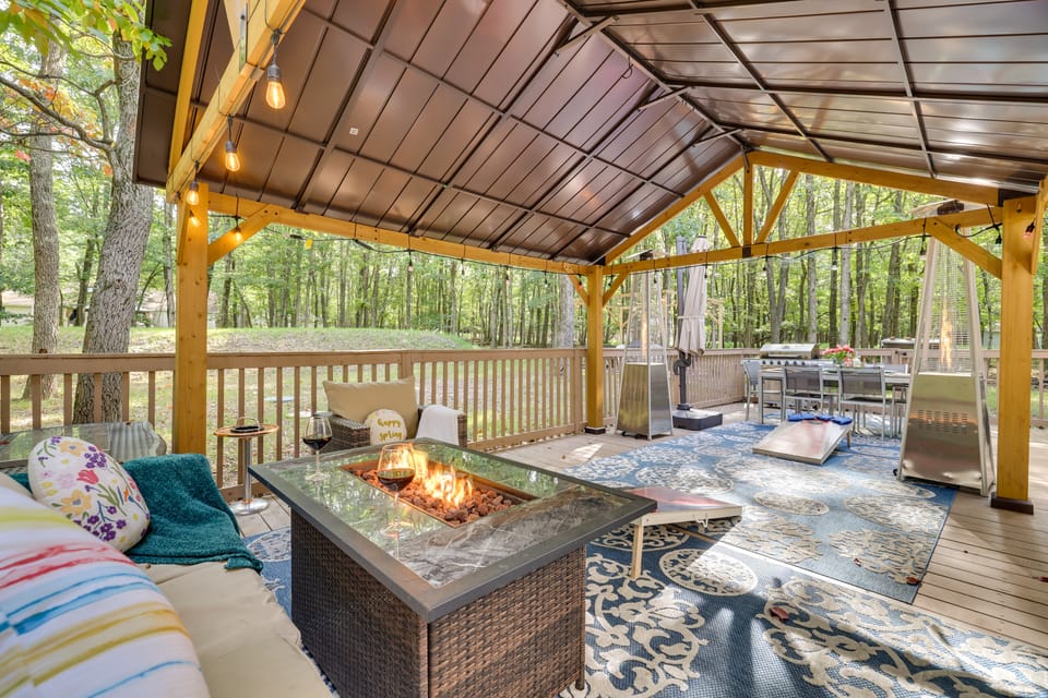 Memories await at this expansive Albrightsville vacation rental! This 4-bedroom, 3.5-bath house boasts an outdoor lounge, 2 cozy fire pits, and access to community amenities like outdoor pools and tennis courts. After trailblazing through Hickory Run State Park or making a splash at Camelbeach Mountain Outdoor Waterpark, you can fire up the grill for dinner and relax amid the property's lush surroundings.