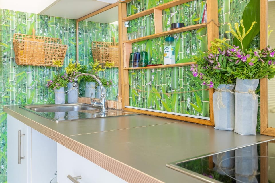 Rozczarowała mnie trzecia sypialnia zrobiona z pomieszczenia gospodaczego (?). Mieści się tam jak na zdjęciu tylko łóżko, jest bardzo ciasno, za łóżkiem za szklanymi przesuwnymi drzwiami (z firankami) jest bojler, mop, suszarka na pranie, leżaki i blat gdzie możesz położyć swoje rzeczy bo w pokoju nie ma szafy, komody ani krzesła i miejsca na walizkę. Nie chciałabym w takiej sypialni spędzić tygodnia urlopu, przyjechałam z koleżankami na 4 noce i się męczyłam. W kuchni brakuje suszarki do naczyń, drobiazg ale po śniadaniu nie ma gdzie odstawić 5 kubków i talerzy do suszenia.