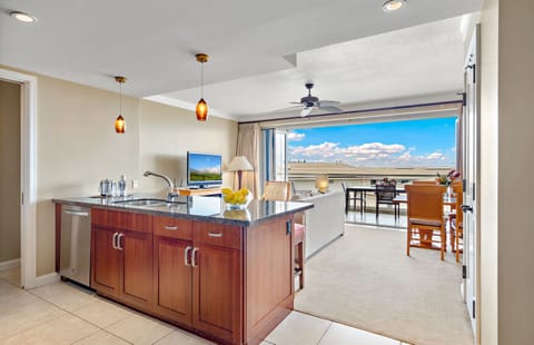 Enjoy unparalleled views of the blue Pacific Ocean from a top-floor vantage point in the two-bedroom corner deluxe suite and relax on its expansive wrap-around balcony overlooking the resort's interior courtyard. Direct ocean views can be seen from nearly every area within the residence, including the kitchen, dining room, and living space.