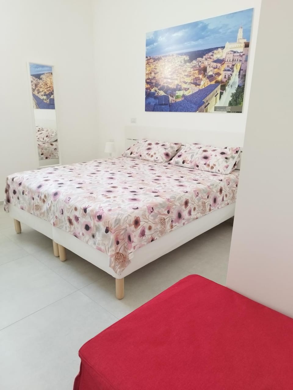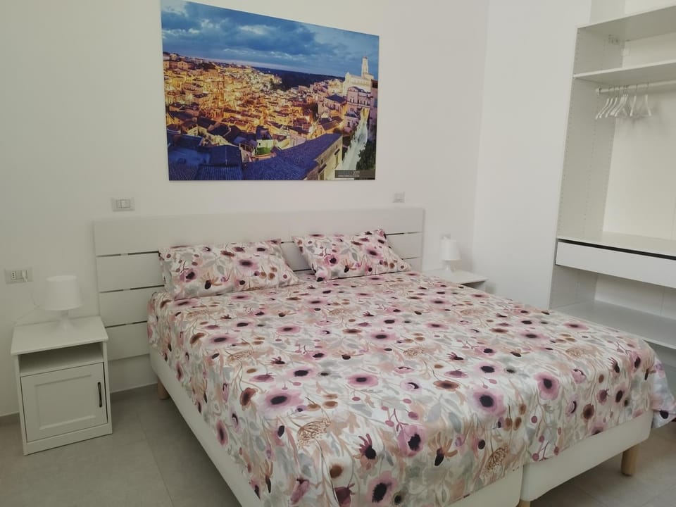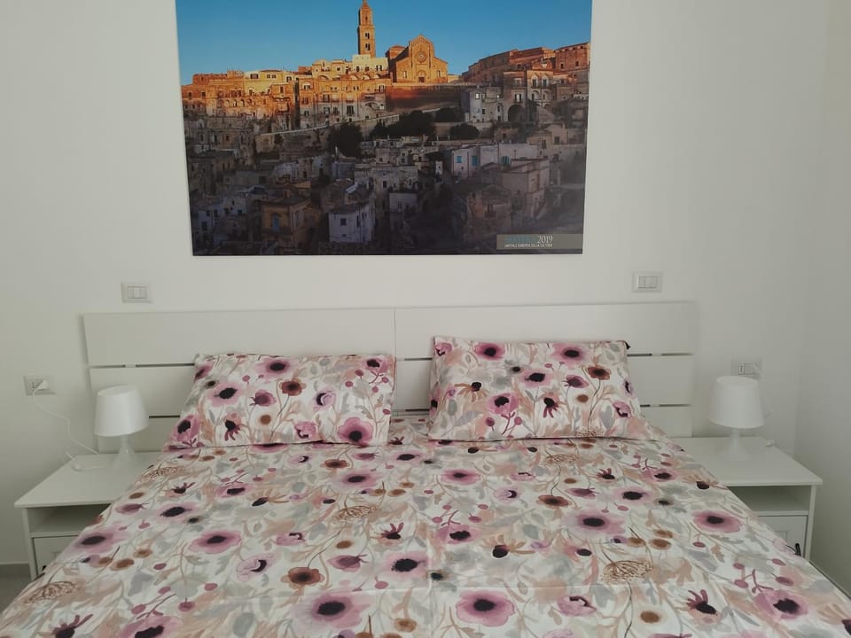 Petite chambre en rez de chaussée. Bouilloire, eau, petits gateaux et machine à café, à disposition alors que le petit déjeuner n'etait pas inlus. Le couple hôte ne parlent pas anglais mais nous avons pu communiquer avec Google translate. Le lit est ferme (très confortable) et nous avons pu nous garer a proximité. Les sassi de matera sont à moins de 15 min à pied.