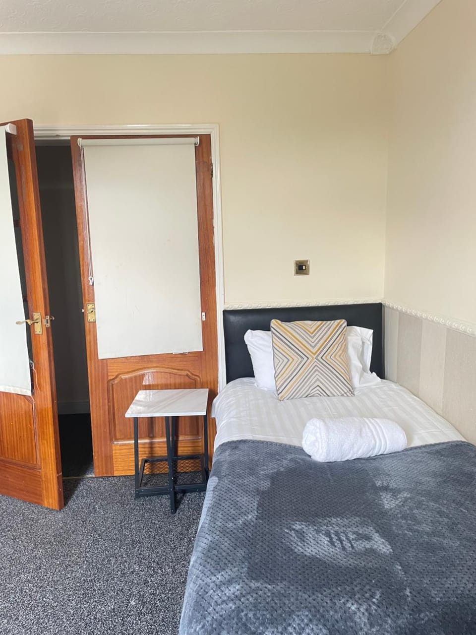 The room is clean. New carpet, bed, and bedlockers. Bed is very comfortable. Clean, white bed linen and towels.