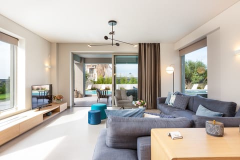 Four en-suite bedrooms are dotted throughout the home, providing you with some much-needed privacy from time to time. All open up directly to the outdoors – either to the immaculate garden or panoramic balconies that look out over the shining sea and Agii Theodori island, depending on the floor. Given the ease of access to the outside spaces, we imagine you'll spend plenty of time stretched out on poolside loungers or curled up in a hanging chair with a good book. Meanwhile, an outdoor dining area is ideal for breakfast in the cool morning air or serving up sumptuous evening meals as the sun drops behind the nearby mountains.